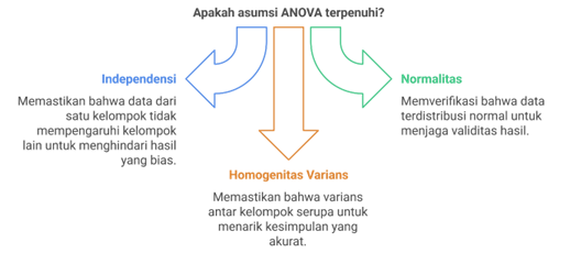 Untuk memastikan hasil ANOVA valid dan dapat diandalkan, terdapat beberapa asumsi dasar yang perlu dipenuhi (Gambar 21.1). Pertama, data dari setiap kelompok yang dibandingkan harus saling independen, artinya nilai-nilai dari satu kelompok tidak boleh memengaruhi nilai-nilai dari kelompok lain. Independensi ini biasanya dijaga melalui prosedur pengambilan sampel yang tepat atau penugasan acak dalam eksperimen.