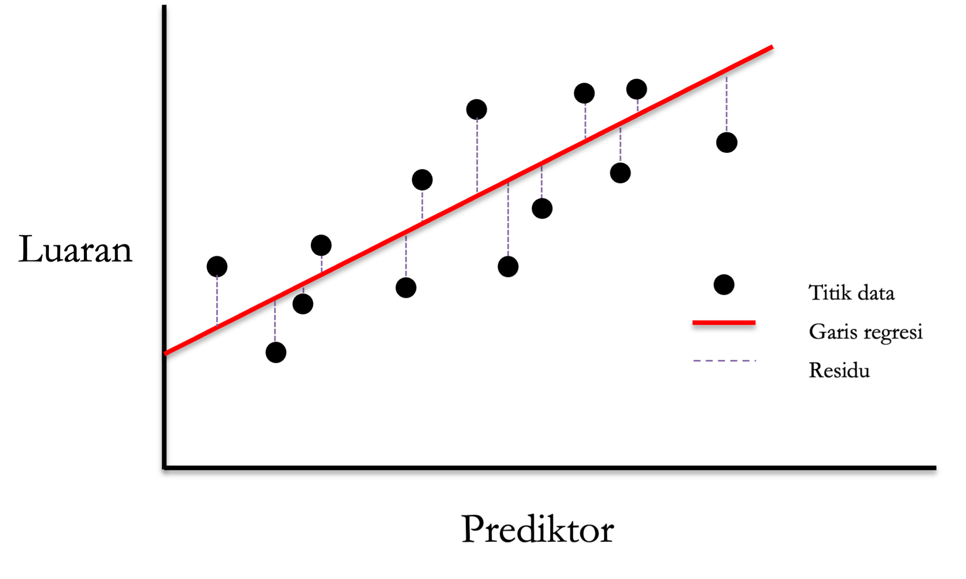 Dalam hal ini, korelasi tidak memberi kita gambaran tentang dampak atau arah hubungan. Di sinilah regresi linear menjadi lebih berguna. Regresi memungkinkan kita untuk memodelkan hubungan fungsional antara satu variabel prediktor (atau variabel independen) dengan satu variabel luaran (atau variabel dependen) (Aiken & West, 1991; Gravetter & Wallnau, 2017). Dengan kata lain, regresi memungkinkan kita untuk memprediksi nilai variabel luaran berdasarkan nilai variabel prediktor. Sebagai contoh, regresi dapat digunakan untuk memprediksi skor ujian berdasarkan jumlah jam belajar.