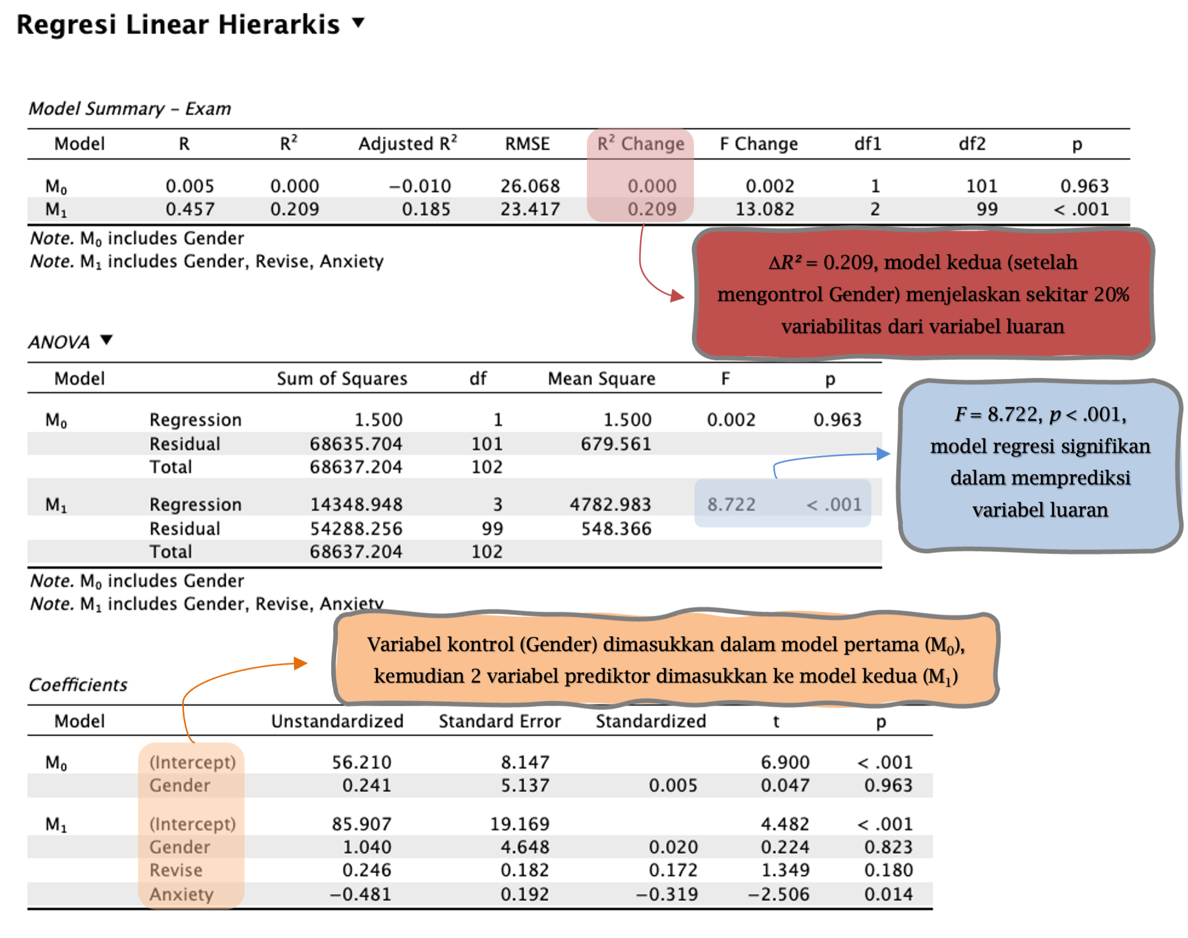 Sebagai contoh, jika perubahan dalam R2 antara dua model adalah 0.12, ini berarti bahwa variabel yang ditambahkan dalam model kedua menjelaskan tambahan 12% variabilitas dalam variabel luaran. Jika perubahan tersebut diuji dengan uji F dan hasilnya signifikan (p < .05), maka kita dapat menyimpulkan bahwa penambahan variabel tersebut memperbaiki model secara signifikan.